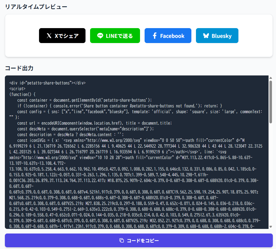 右側にリアルタイムで生成されるプレビューを確認し、問題なければ「コードをコピー」ボタンを押します。
