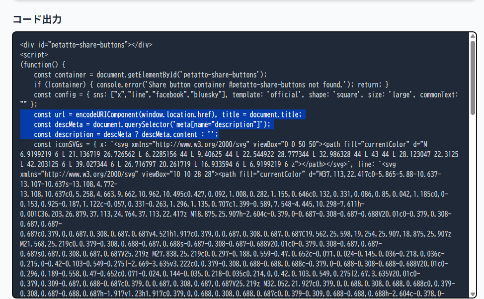 生成されるコードは、設置されたページのタイトルやURL、説明文(description)を自動で読み込んでシェア文を作成します。あなたがやることは、一度コードを貼るだけ。あとはどのページでシェアされても、最適な内容が自動で設定されます。